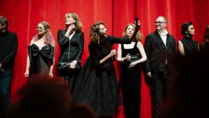Weißt du noch damals, als ich bei der Berlinale-Premiere auf die Bühne durfte? Um sicherzugehen, dass dieser Moment nicht vom Strudel der Zeitgeschichte verschluckt wird, greift diese Schauspielerin lieber nochmal zum Handy: Selfie bei der Aufführung von “DAU. Degeneratsia” im Haus der Berliner Festspiele.